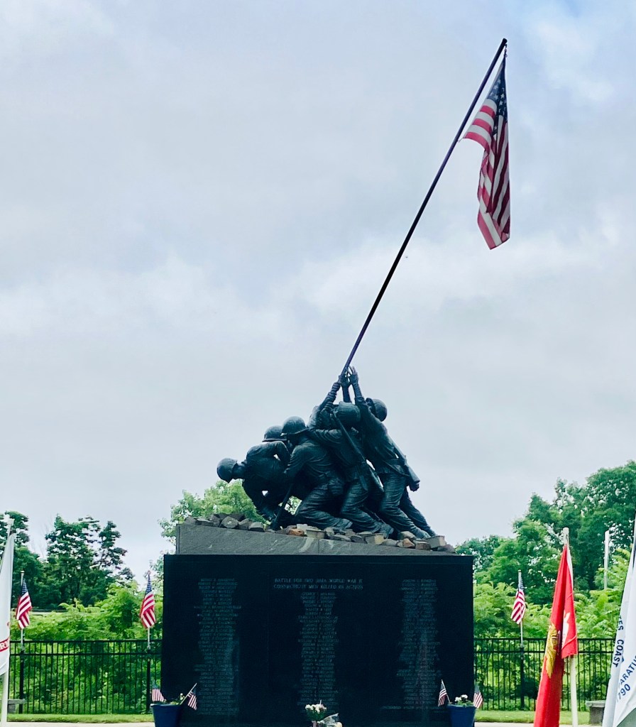 According to the Iwo Jima Association: “On Feb 23, 1995 the monument was dedicated in memory of the 6,821 Americans who lost their lives on Iwo Jima. The names of the 100 Connecticut men who died are inscribed on the monument, and 100 flags are flown at the Park to commemorate their sacrifice.”