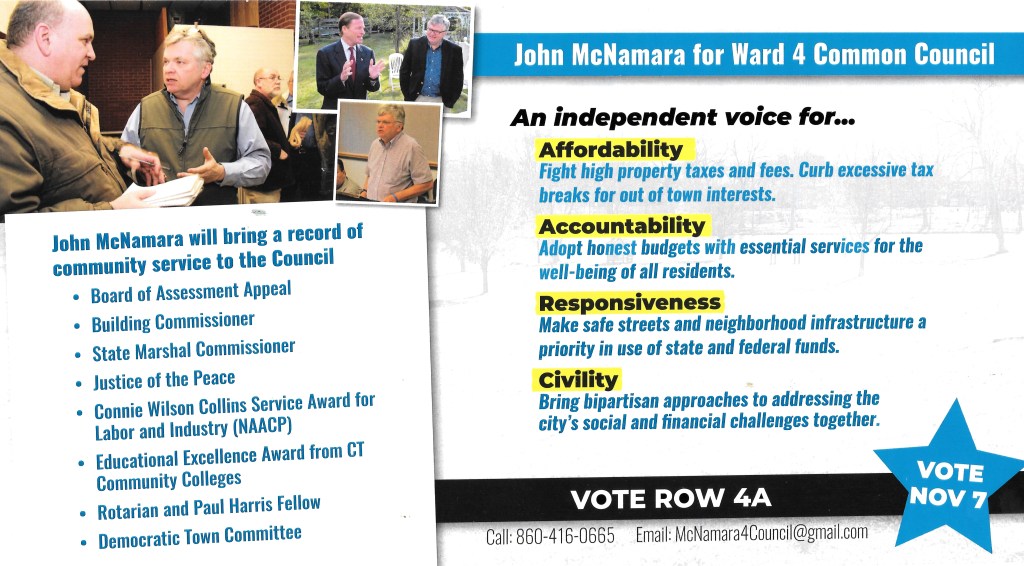 Paid for by New Britain Democratic Town Committee, John Tully, Treasurer and McNamara 4 Council Committee, Michael McNamara, Treasurer. Approved by all candidates